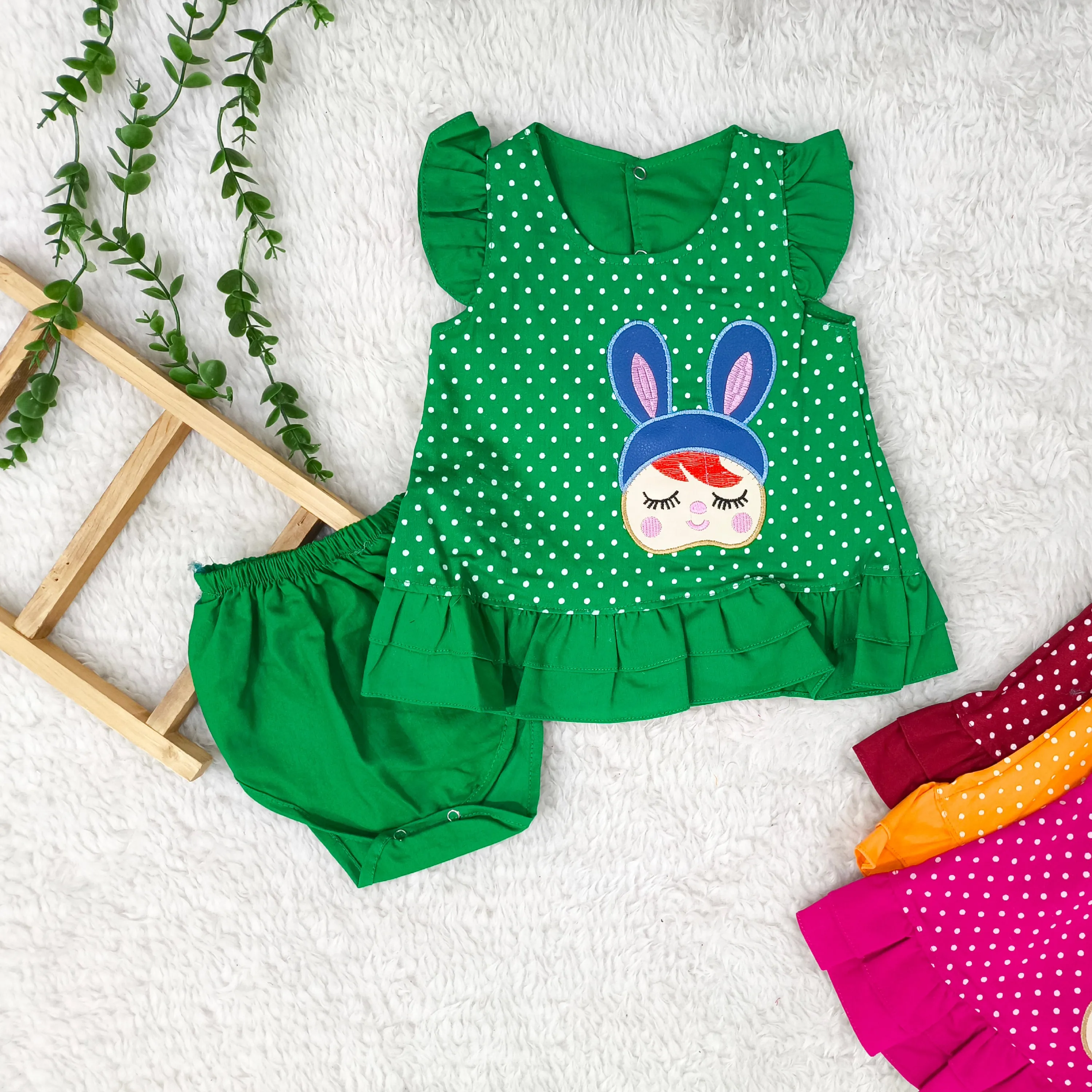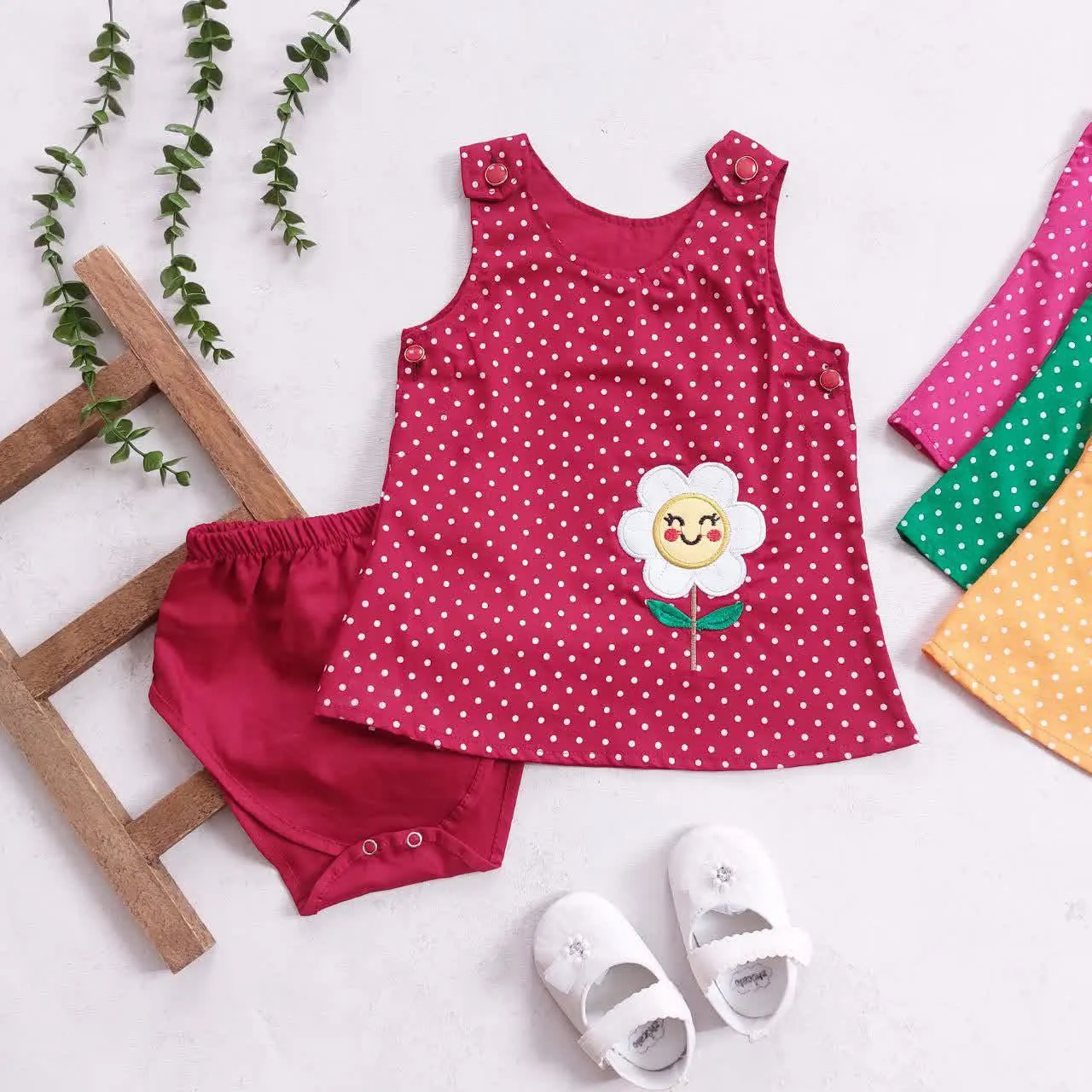 سارافون و شورت نوزادی دخترانه طرح خال خالی جنس کتان نخ خنک و لطیف در چهار رنگ و دو سایز