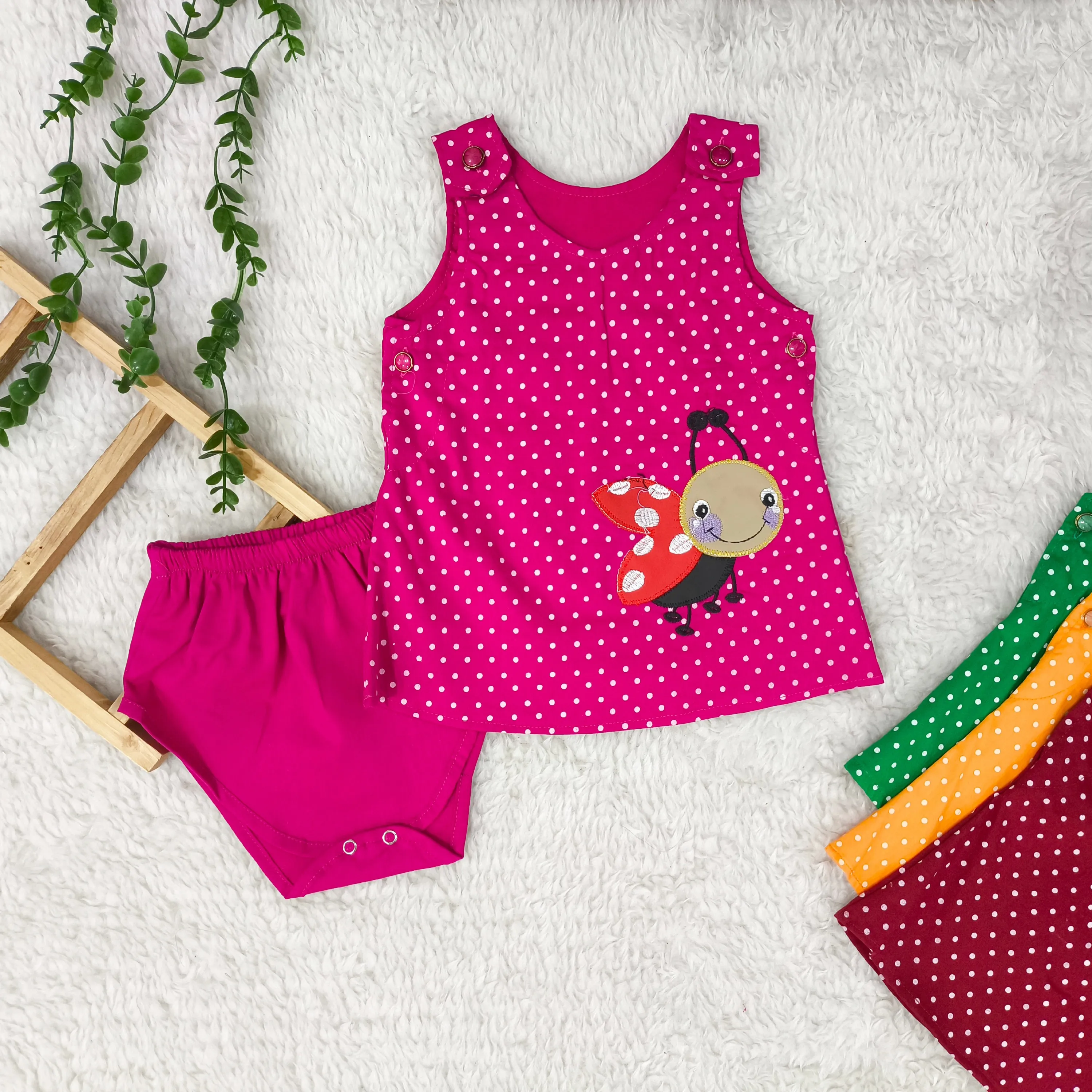 سارافون و شورت نوزاد دخترانه طرح کفشدوزک | جنس کتان نخ خنک | سایز 6 ماه تا 2 سال