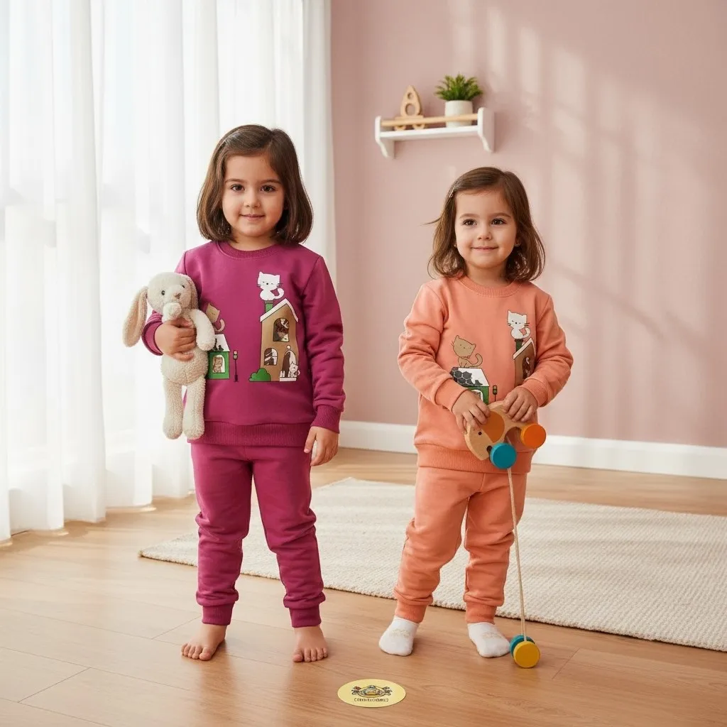 ست بلوز و شلوار بچگانه طرح گربه و خانه، پنبه دورس لاکرا، مناسب 1 تا 5 سال