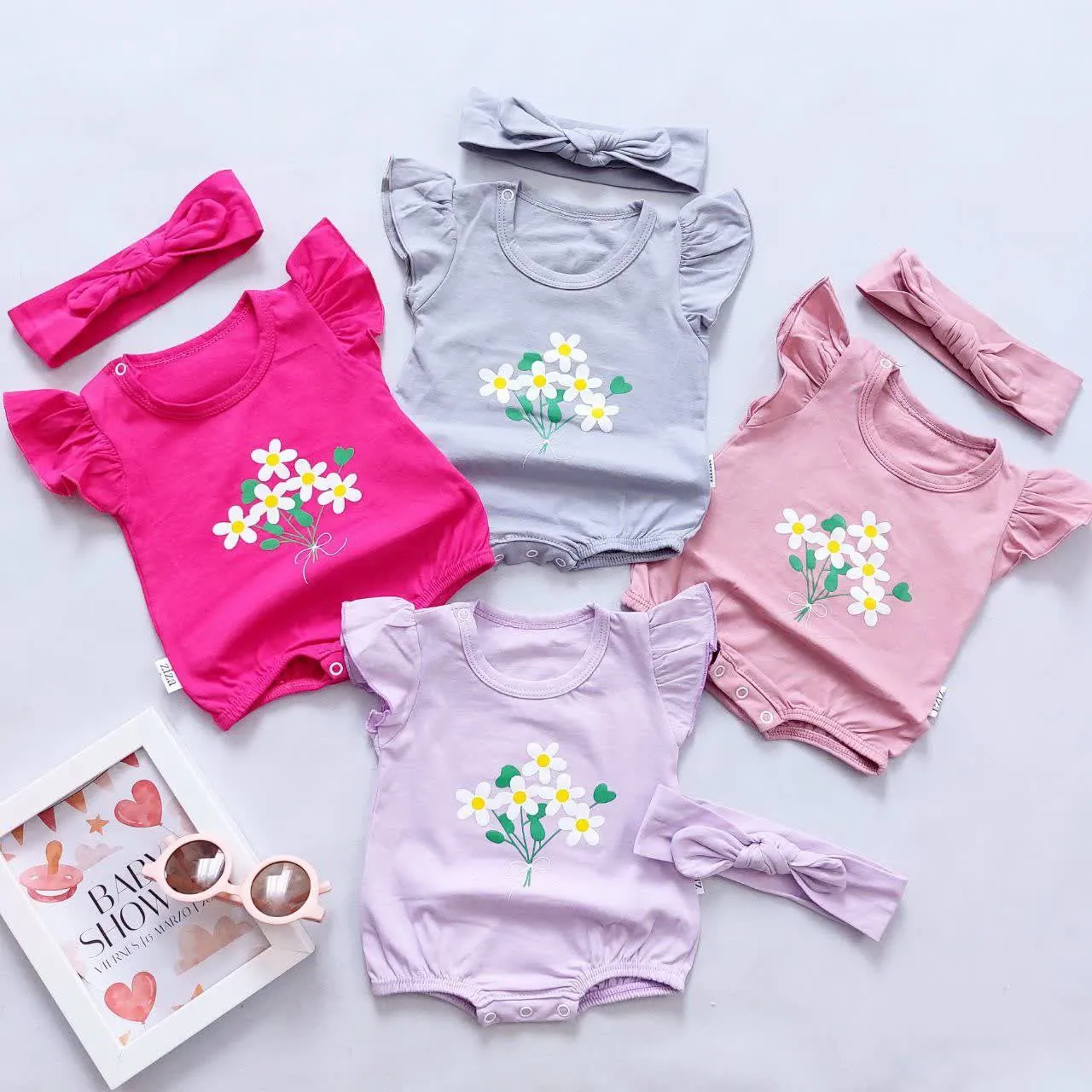 رامپر و هدبند نوزاد دخترانه پنبه ای طرح شکوفه، سایز 0 تا 8 ماه، چهار رنگ