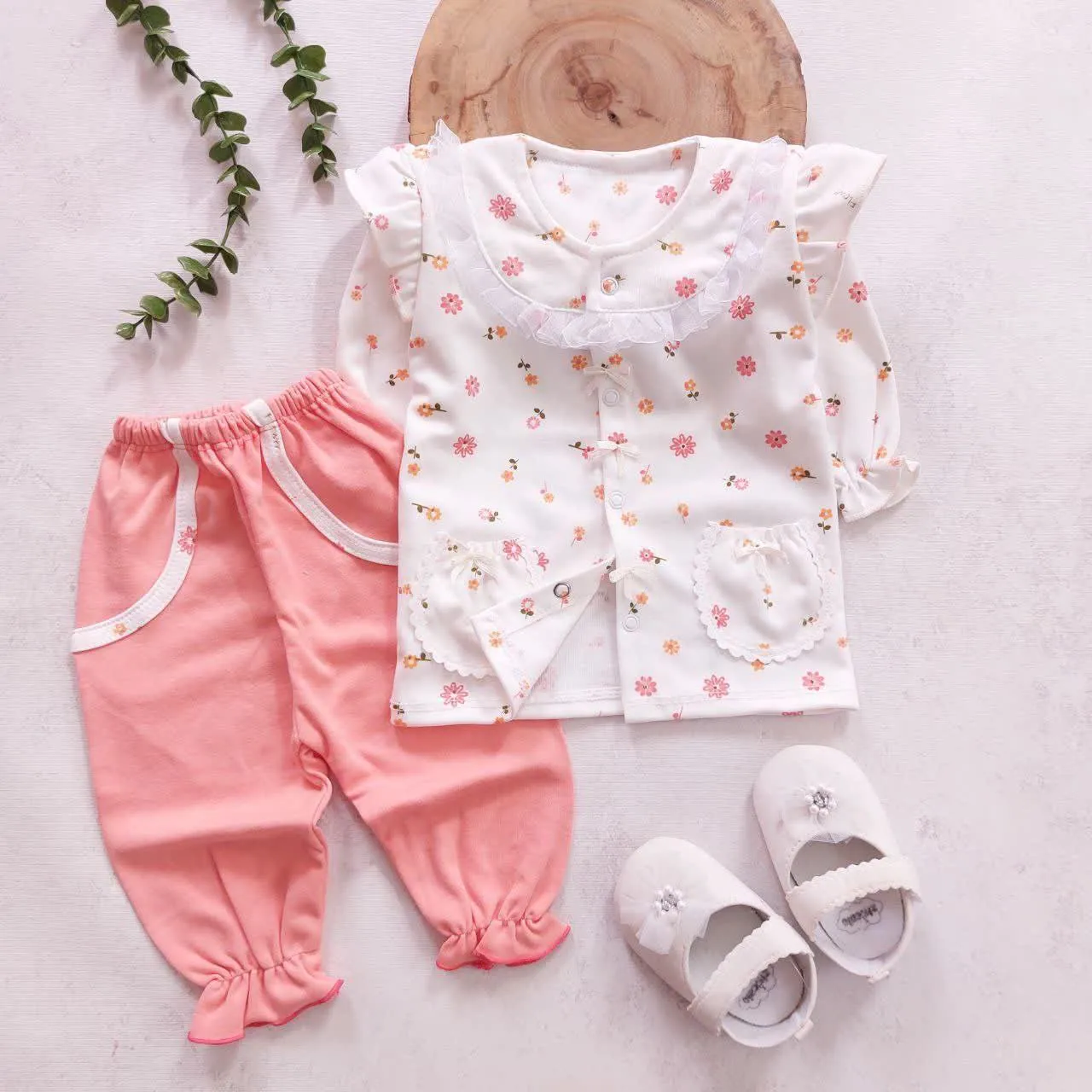مانتو شلوار نوزادی گل گلی پنبه ای دوجیب مناسب 6 تا 36 ماه