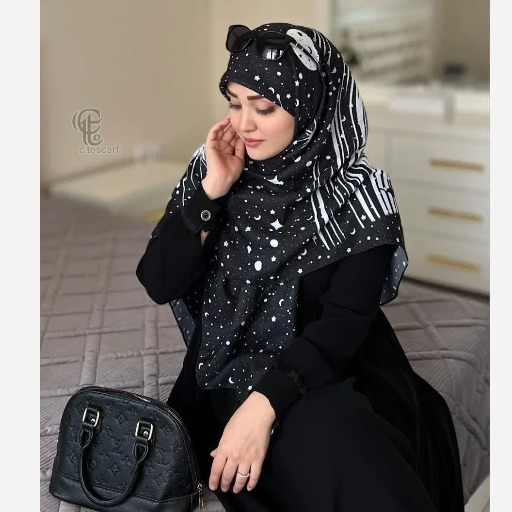 روسری زنانه ماهلین مشکی با طرح ماه و ستاره سفید | روسری شیک