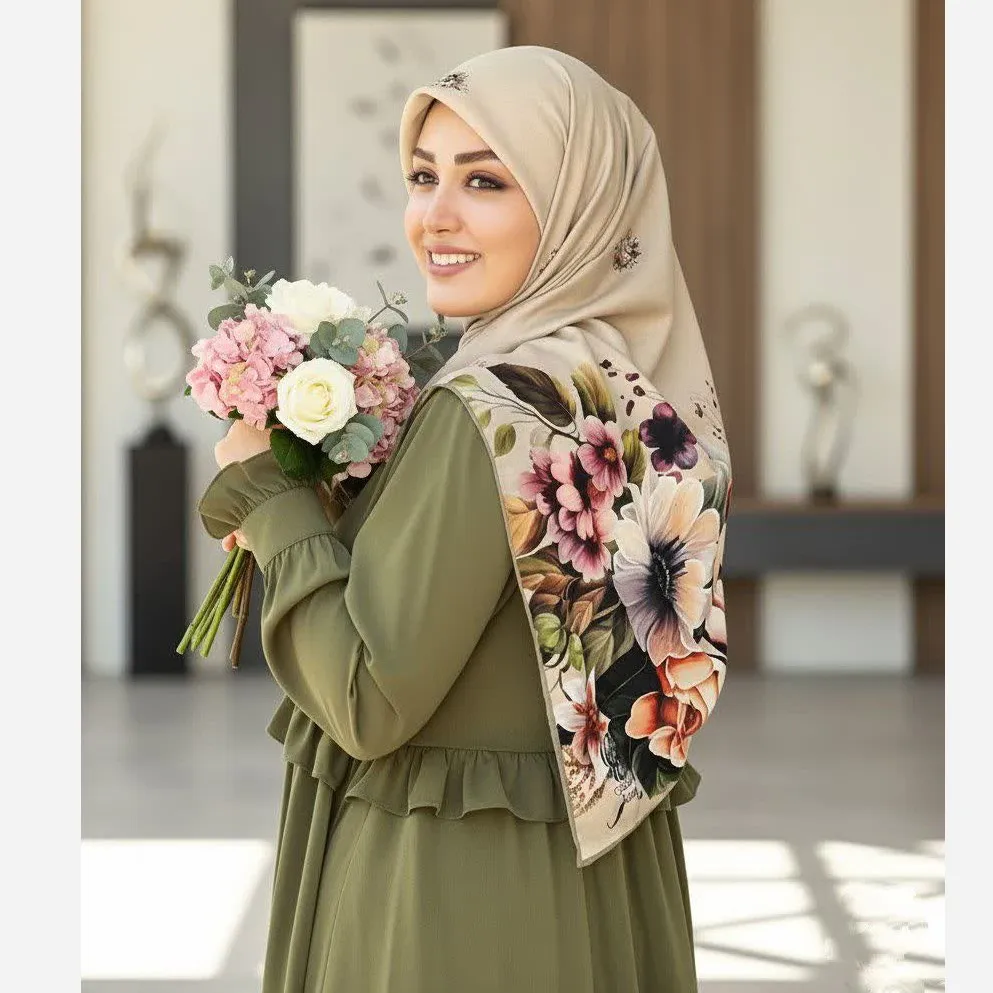 روسری طرح صوفیا سیتو جنس نخ کاستوم چرخدوز در سه رنگ کرم هلویی، یاسی، سبز