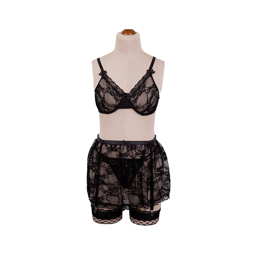 ست لباس زیر زنانه تور و گیپور شورت، سوتین، دامن و جوراب
