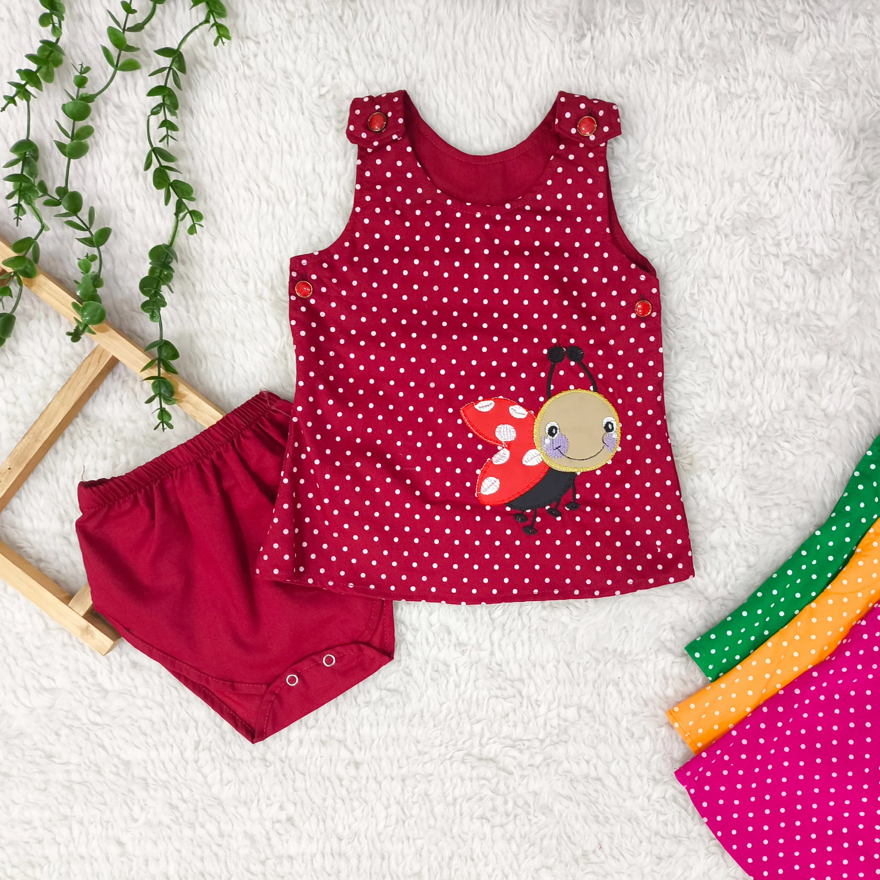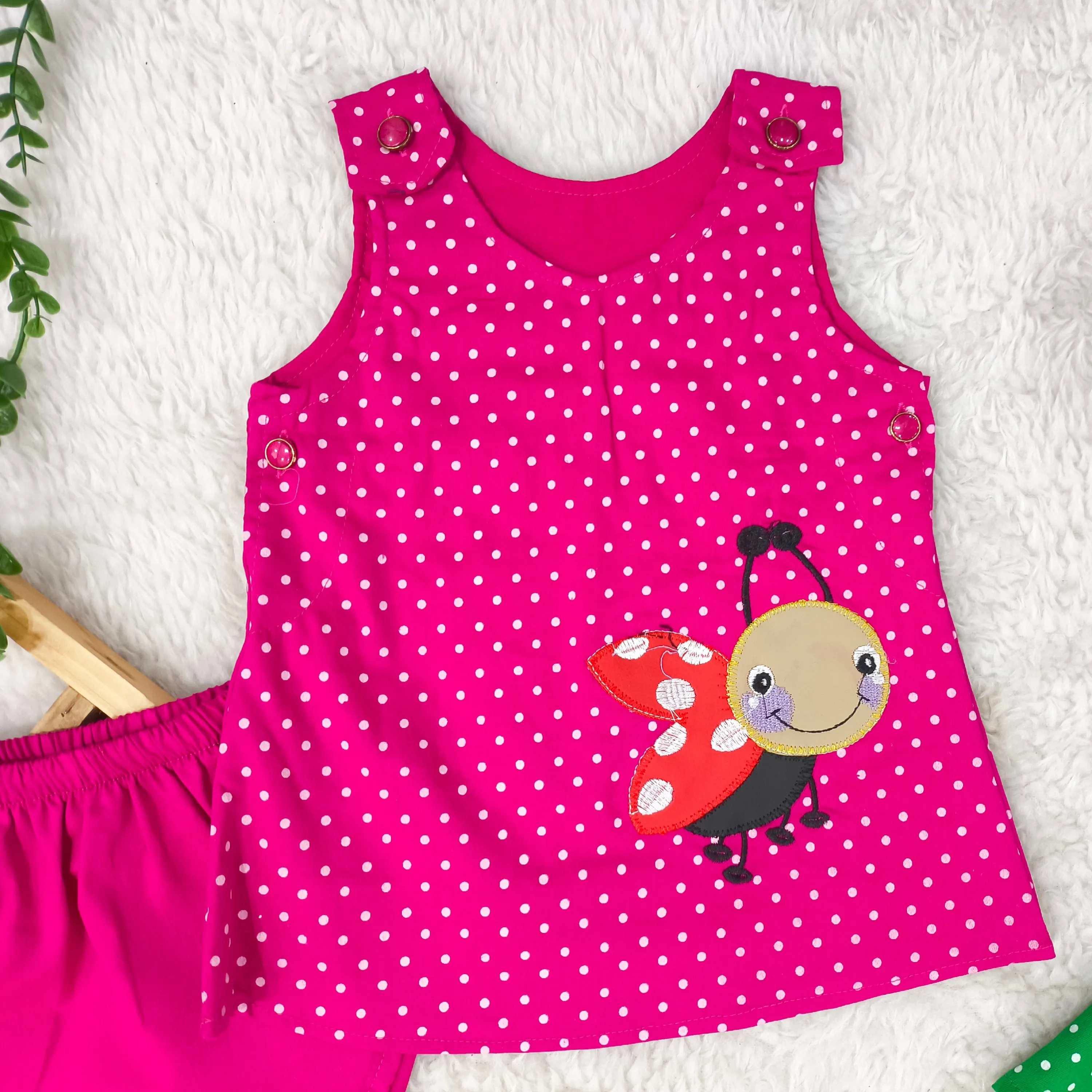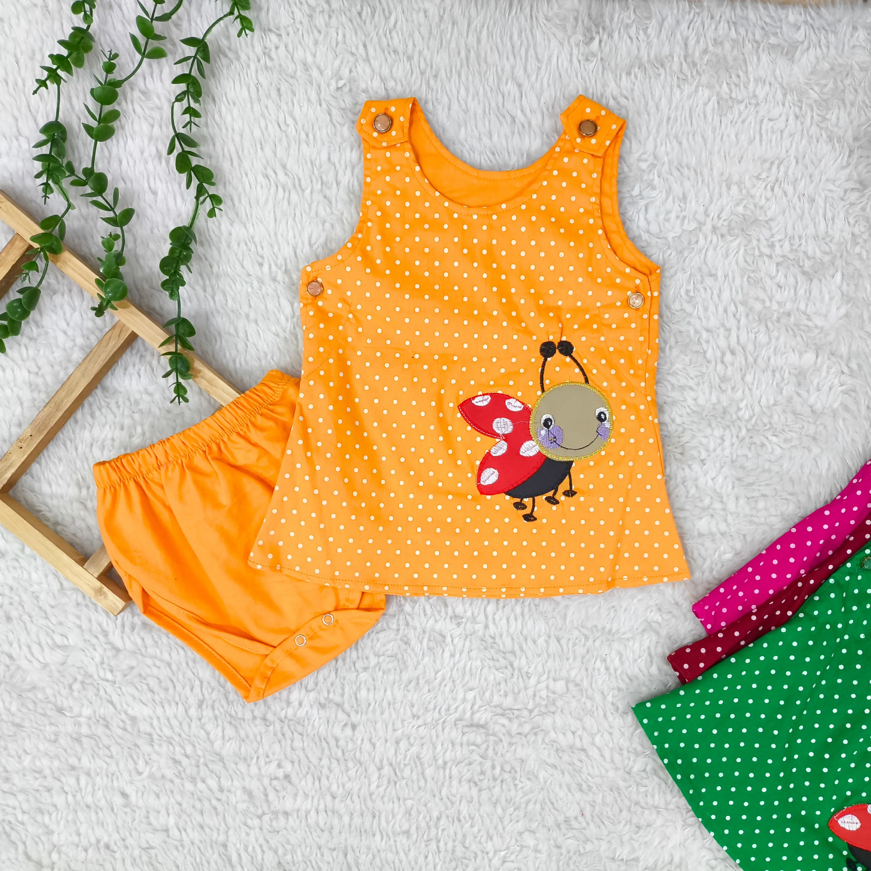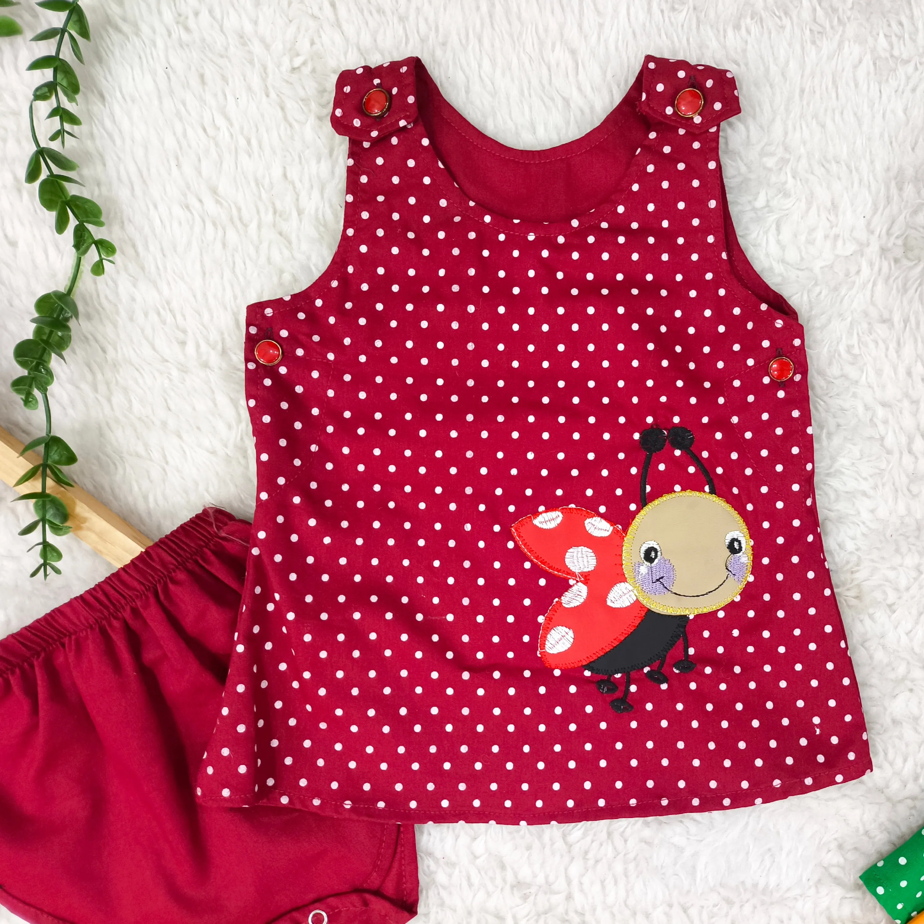**سارافون و شورت نوزادی دخترانه طرح کفشدوزک | جنس کتان | سایز 6 ماه تا 2 سال**
