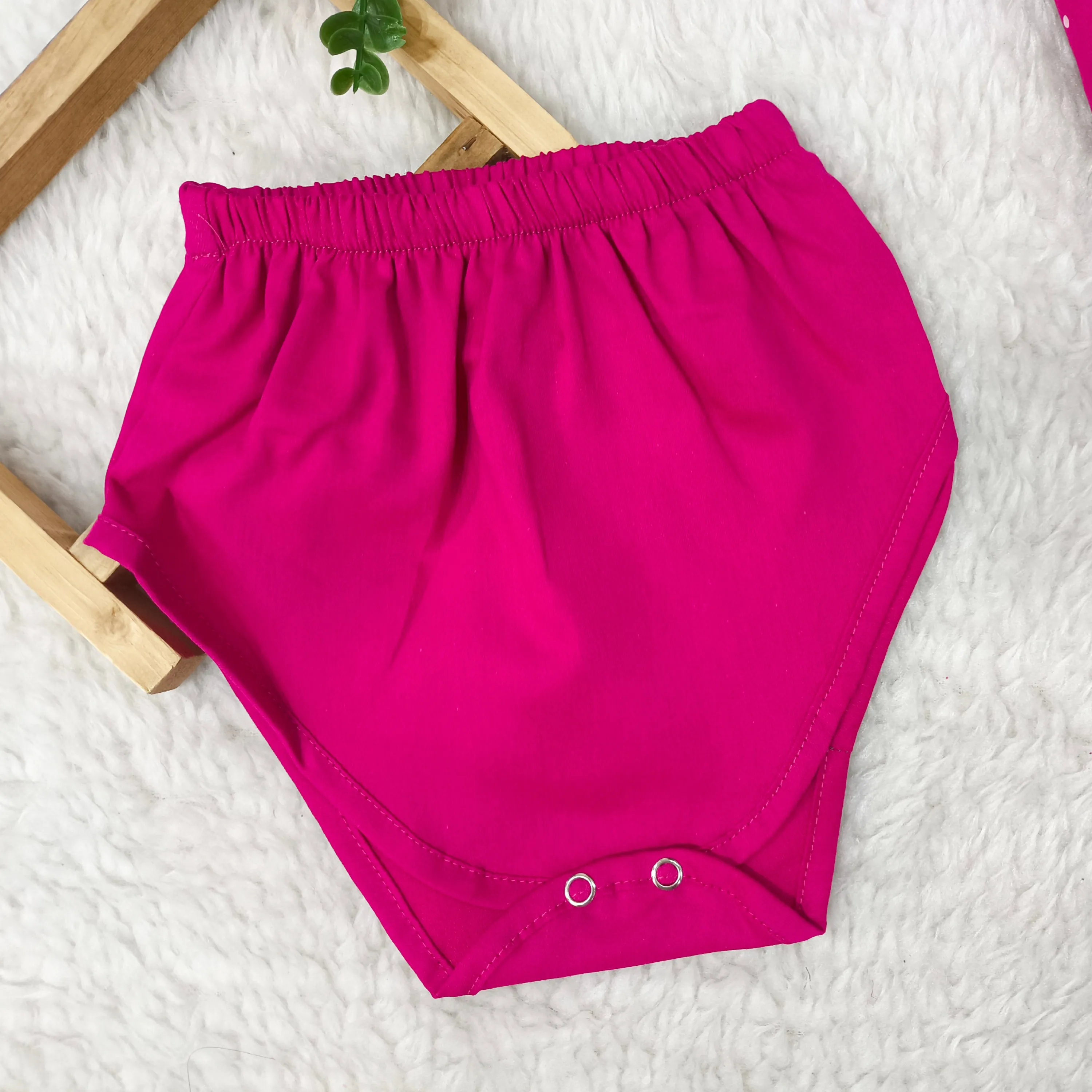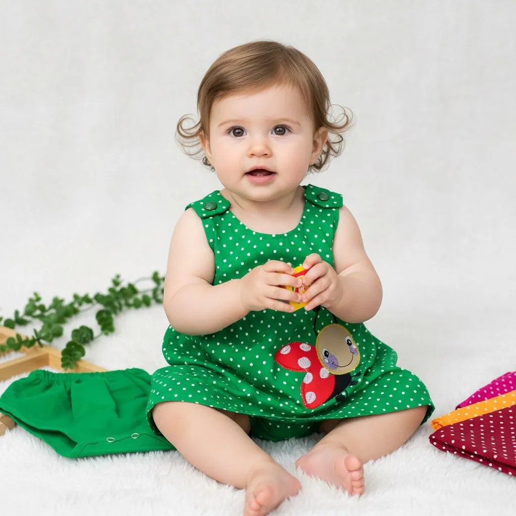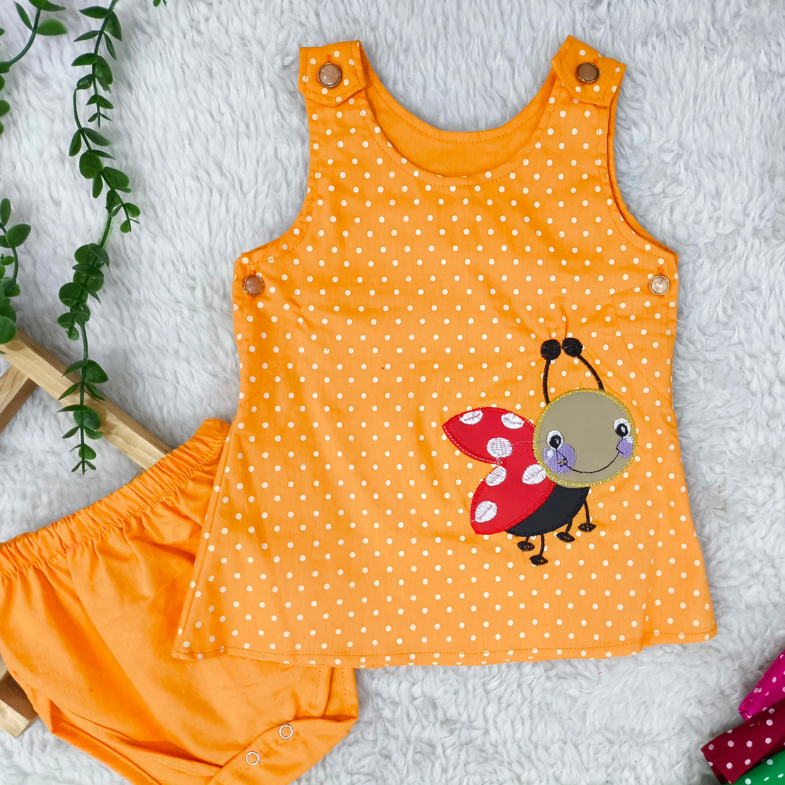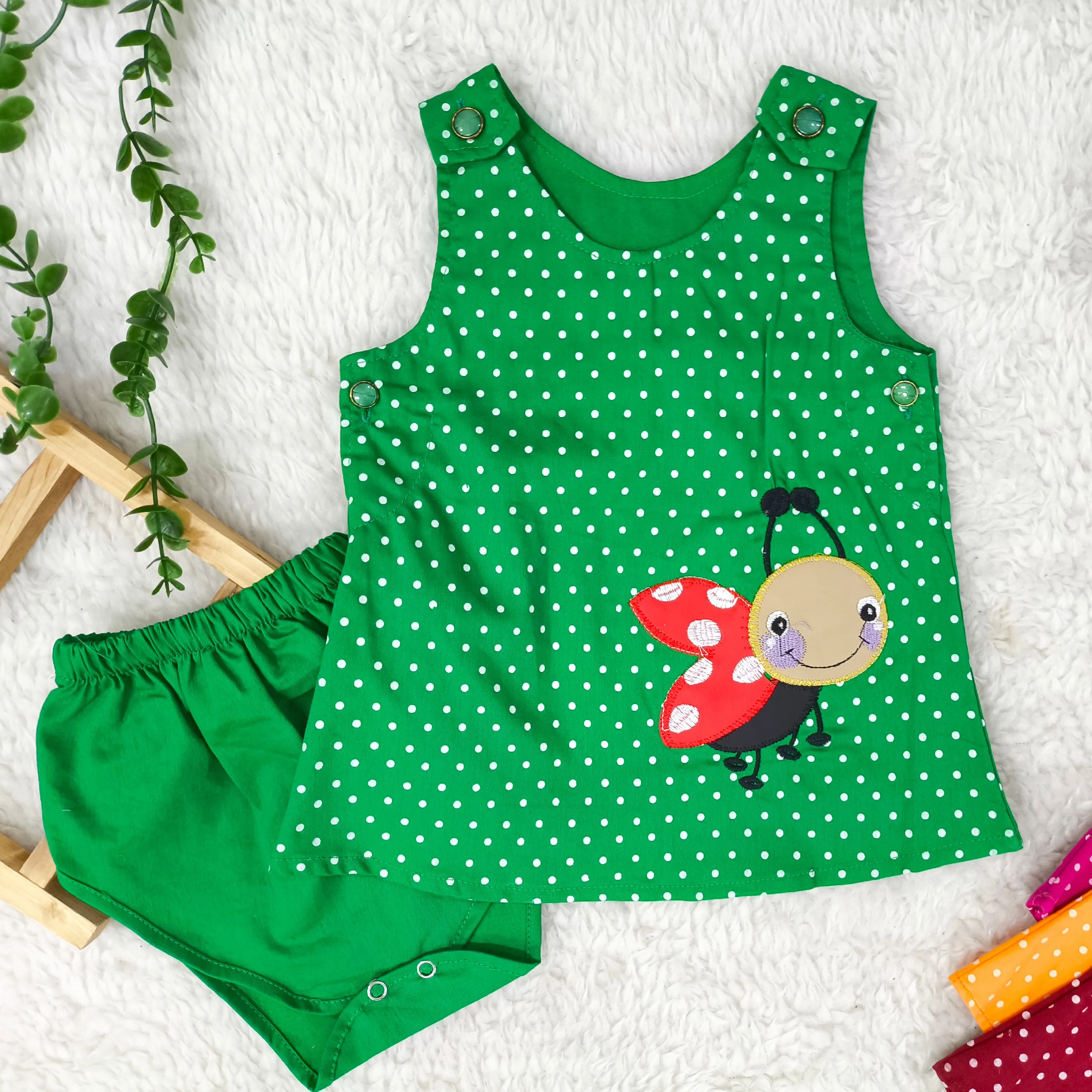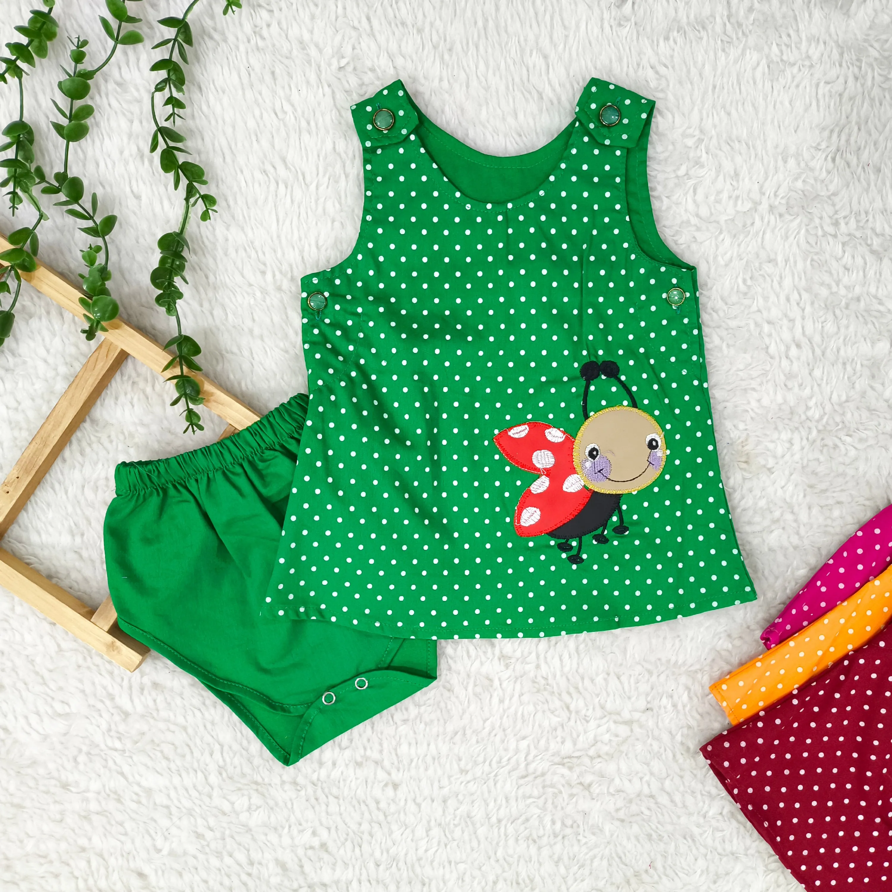 **سارافون و شورت نوزادی دخترانه طرح کفشدوزک | جنس کتان | سایز 6 ماه تا 2 سال**