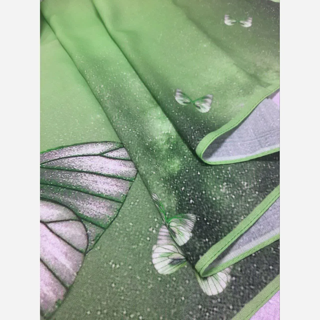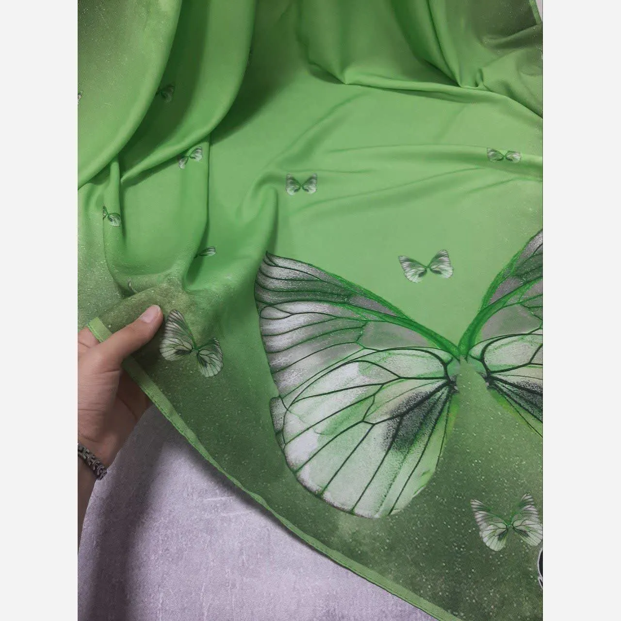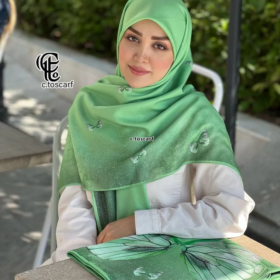 طراحی خاص این روسری شامل طرح پروانه و جزئیات درخشان است که جلوهای منحصر به فرد به آن میبخشد. به دلیل جنس مرغوب و چرخدوز بودن، این روسری لیز نیست و به راحتی روی سر قرار میگیرد و ثبات خوبی دارد.