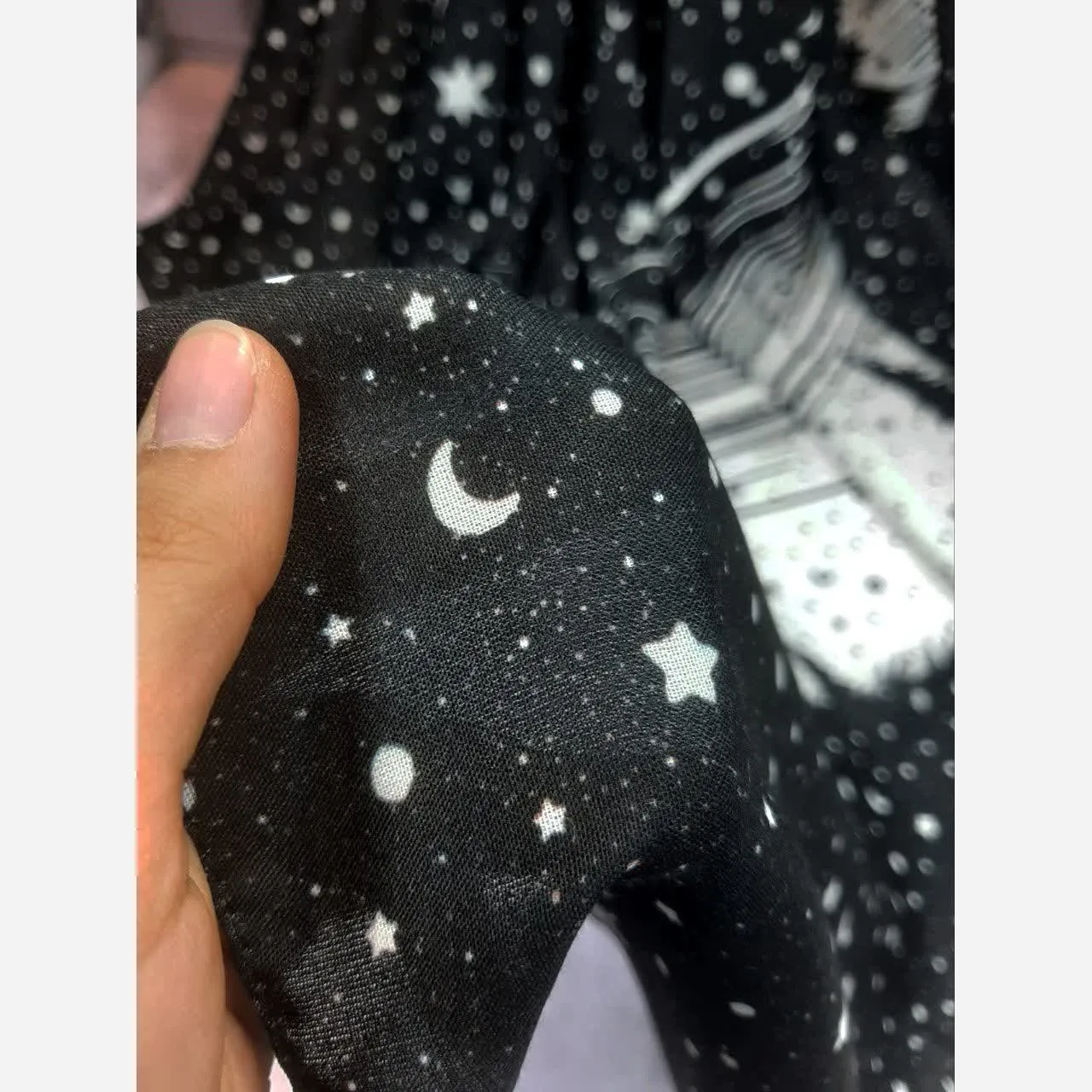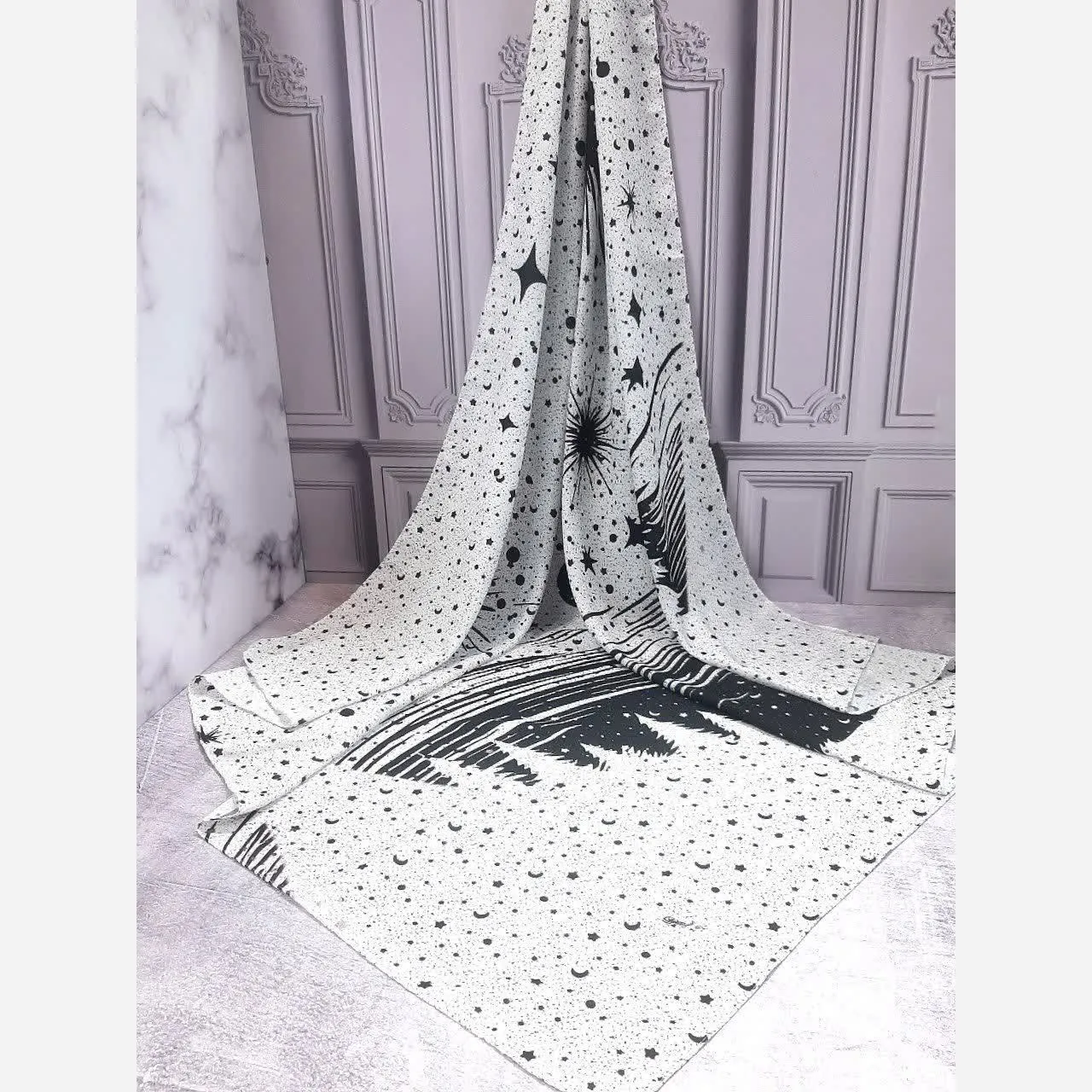 روسری زنانه طرح ماه و ستاره مشکی کد 123، با زمینهای مشکی و طرحی خیرهکننده از ماه و ستارههای سفید، جلوهای منحصر به فرد و هنری به استایل شما میبخشد. این طرح چشمنواز، شبیه به یک بوم نقاشی، جزئیاتی خاص و زیبا به پوشش روزانه یا مجلسی شما اضافه میکند.