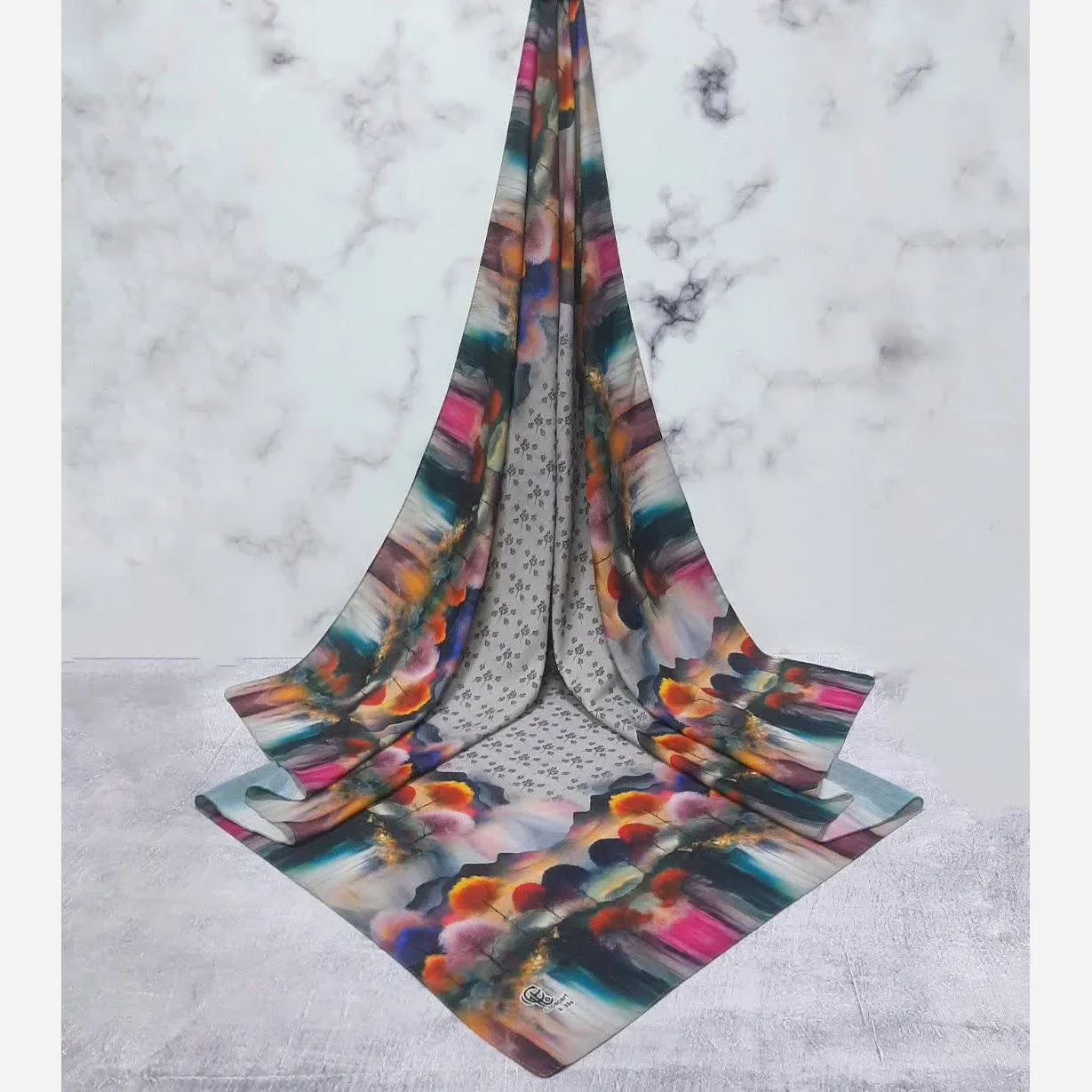 روسری طرح پارمیس زمینه طوسی نخی چرخ دوز 115 سانتی متر
