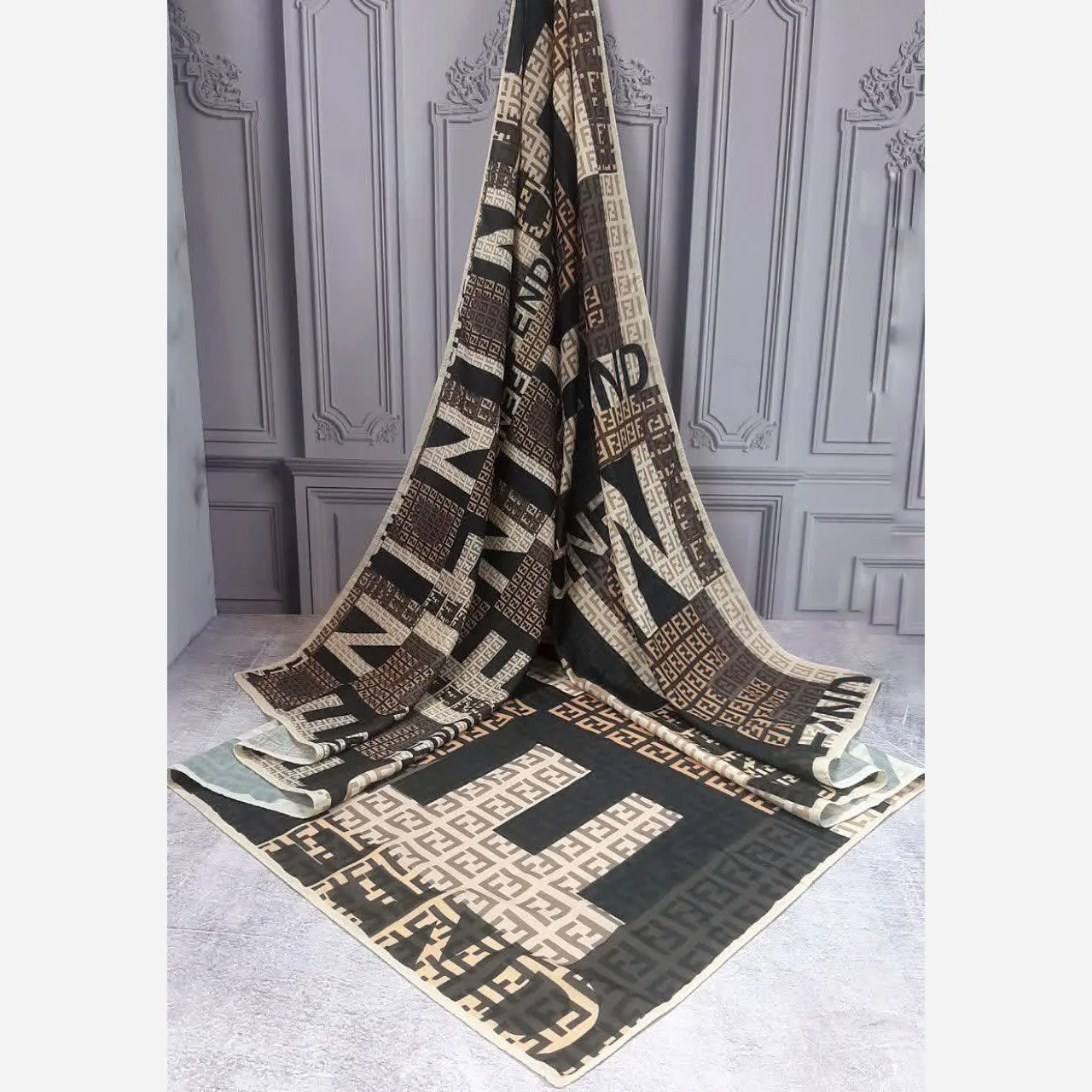 شال نخی طرح فندی کرم مشکی قهوه ای قواره بزرگ 140 سانتی متر چرخدوز