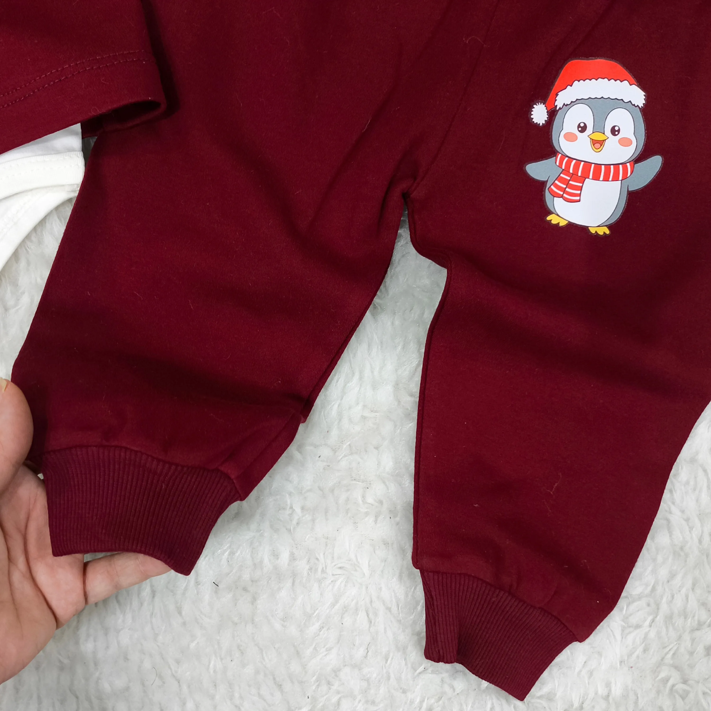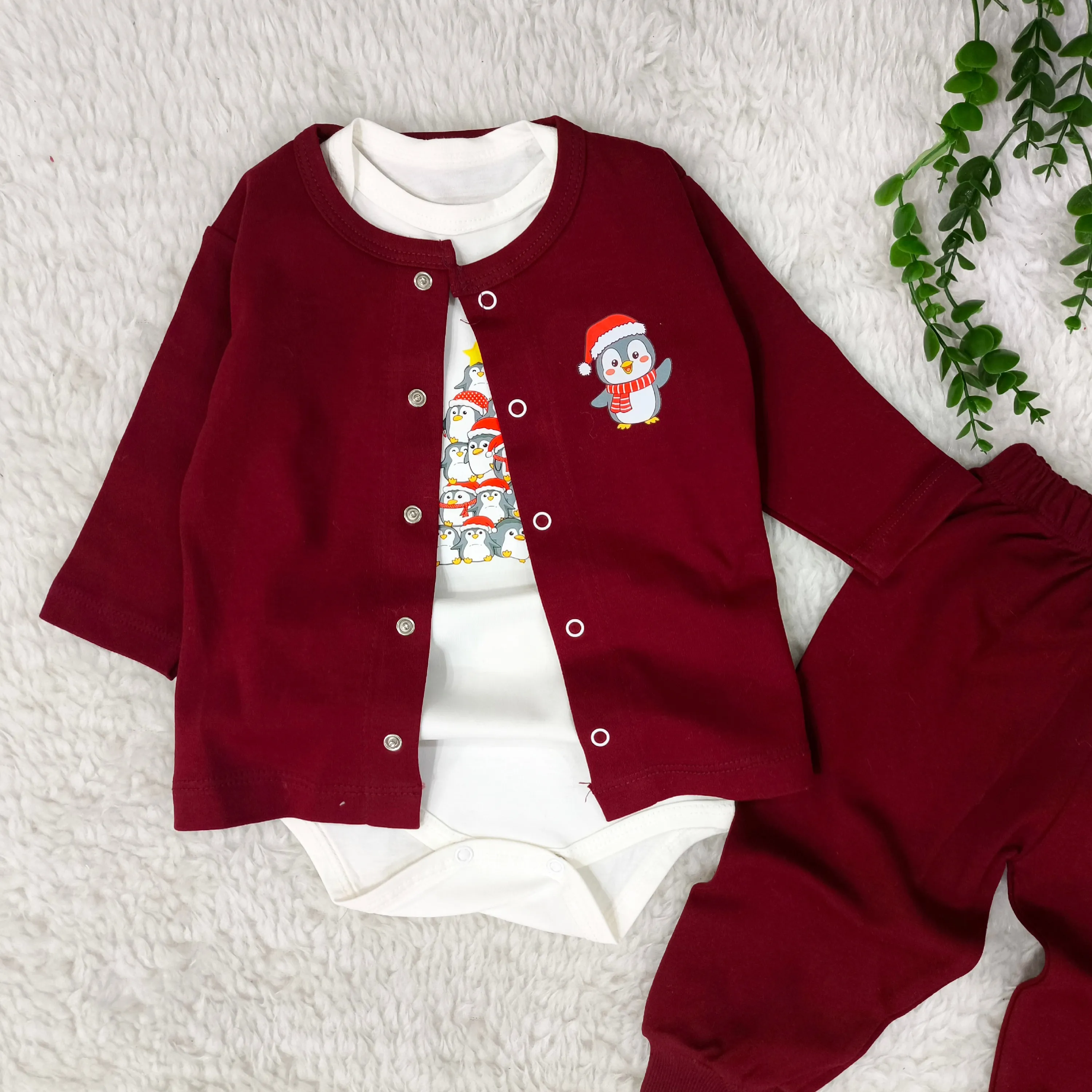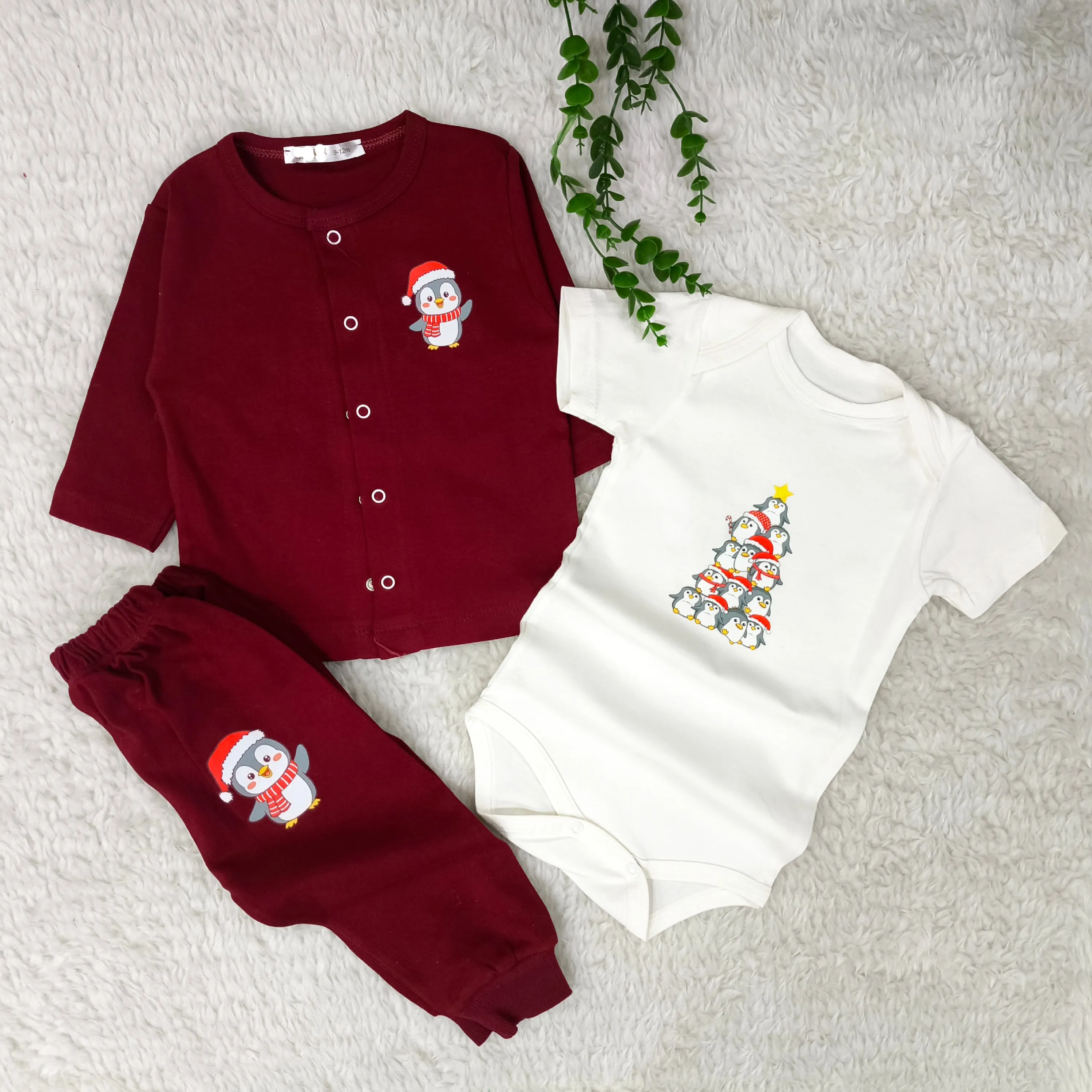 سه تکه بلوز شلوار و بادی نوزادی دخترانه پسرانه ست یلدایی پنگوئن