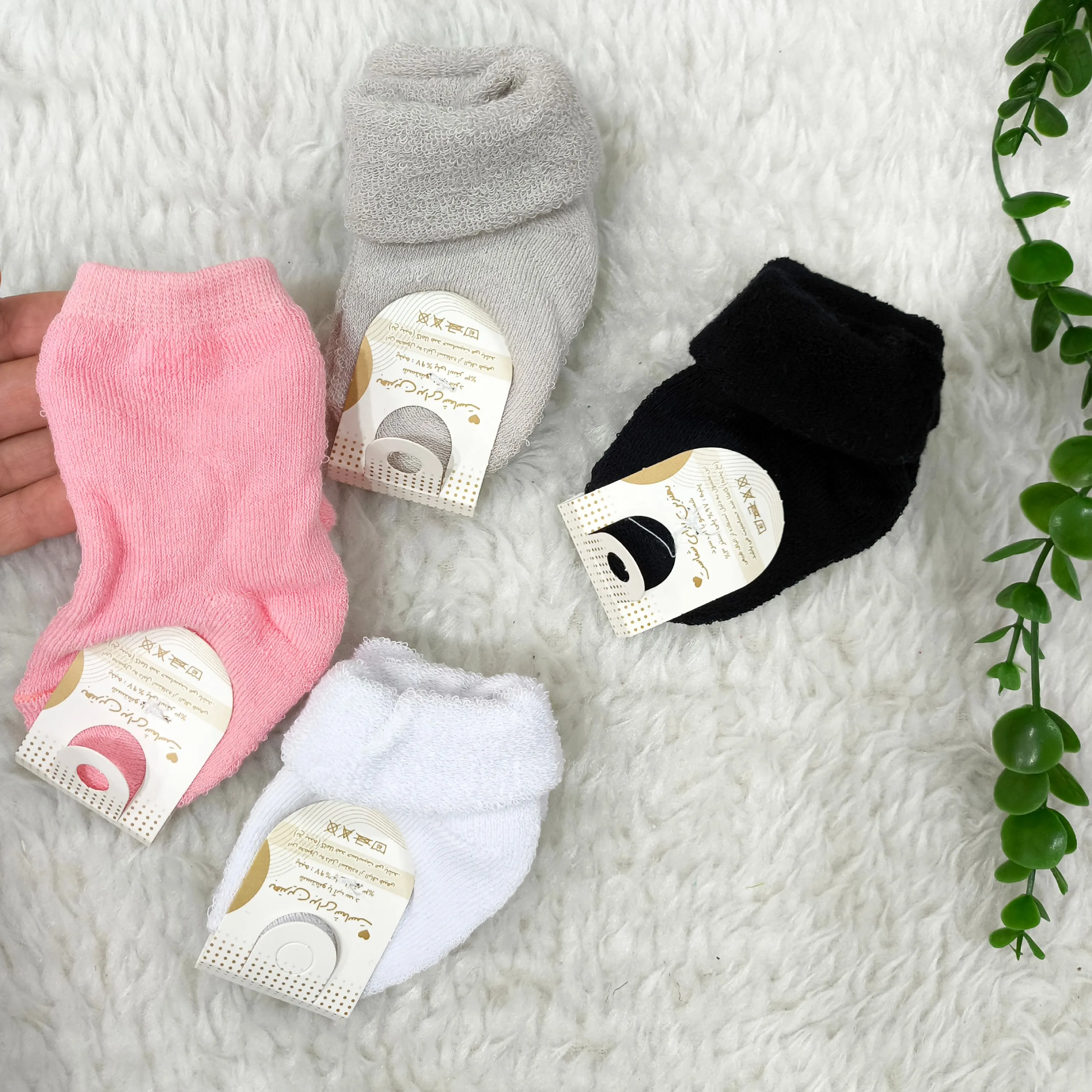 * **جنس مرغوب:** ساخته شده از 100% نخ پنبه خالص، این جورابها بسیار نرم، لطیف و سازگار با پوست حساس نوزادان هستند.